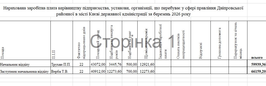 31.03.2026 Нарахована заробітна плата керівництву відділу молоді та спорту Дніпровської районної в місті Києві державної адміністрації за березень 2026 року
