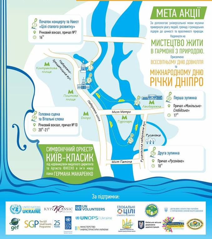 В рамках акції передбачається проведення низки заходів на різних майданчиках міста Києва на річці Дніпро - біля Микільсько-Слобідської та Русанівської набережних, Поштової площі. Основною подією є концерт симфонічного оркестру на воді. Корабель з оркестром буде курсувати по маршруту: Річковий вокзал - Микільсько-Слобідська - Русанівка - Річковий вокзал.