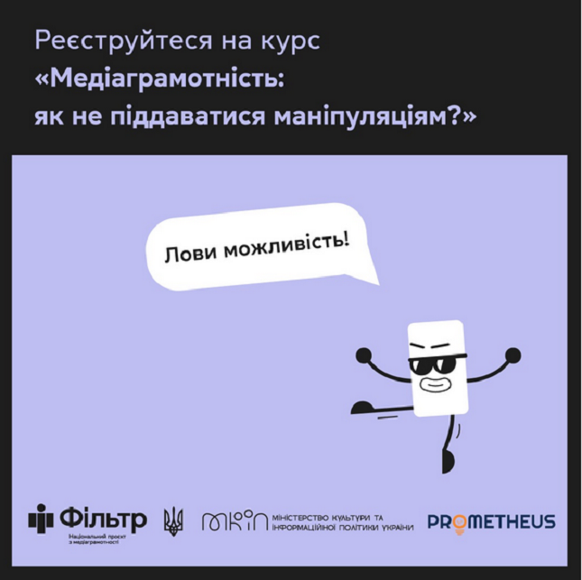 Національний проєкт з медіаграмотності «Фільтр» та платформа онлайн-освіти Prometheus підготували для вас безкоштовний відеокурс «Медіаграмотність: як не піддаватися маніпуляціям?»