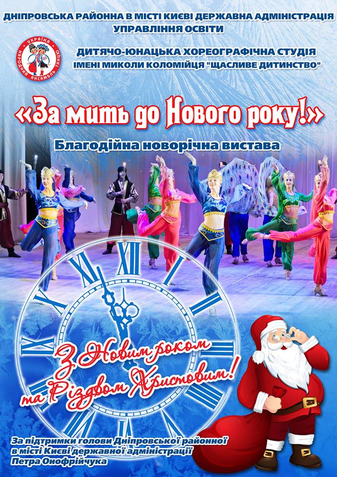 20 та 21 грудня, напередодні Новорічних та різдвяних свят, в Центрі культури та мистецтв Дніпровського району (вул. Алма-Атинська, 109) відбудуться благодійні новорічні вистави "За мить до Нового року". Заходи відбудуться для школярів району за підтримки Дніпровської районної в місті Києві державної адміністрації.