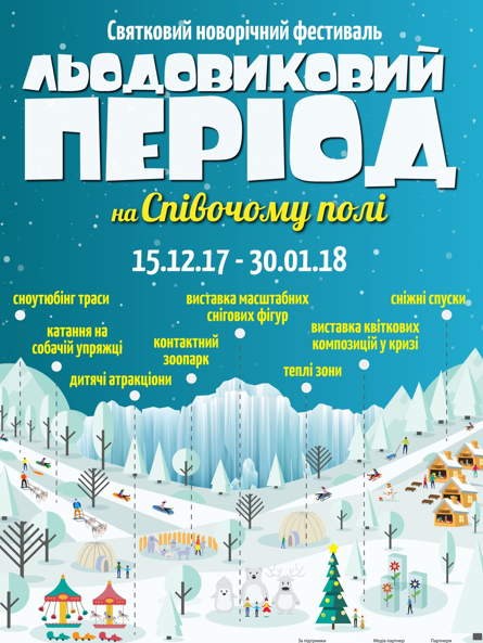 Нагадуємо, що з 15 грудня 2017 по 30 січня 2018 року для киян і гостей міста відбуватиметься справжня зимова казка – новорічний фестиваль «Льодовиковий період» на Співочому полі».