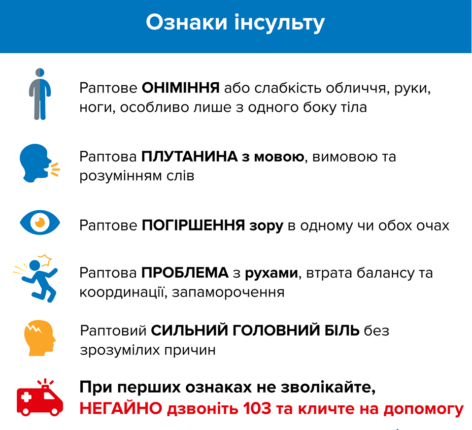 Термінове розпізнавання ознак інсульту та звернення за кваліфікованою медичною допомогою впродовж 3 - 6 годин від його початку дозволить зберегти життя хворого та попередити розвиток важких наслідків.