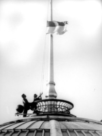 24 серпня 1991 року український стяг внесли до зали засідань, але над куполом так і не підняли. На сесійному засіданні 4 вересня опозиційні депутати від фракції Народної Ради ініціювали узаконити та підняти над будівлею синьо-жовтий прапор. Парламентська комуністична більшість не бажала цього.