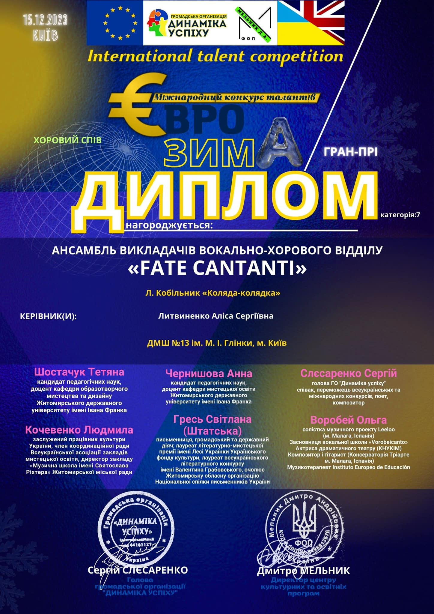 Ансамбль вчителів вокально-хорового відділу «Fate cantanti» Дитячої музичної школи №13 ім. М.І. Глінки Дніпровського району взяв участь в Міжнародному конкурсі талантів «Євро Зима» (Київ-Лондон).