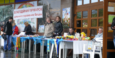 Сьомий благодійний ярмарок вчора відбувся у черговому мікрорайоні – Соцмістечко. Досі організатори не мали клопоту з примхами погоди, та ось маєш: тільки збиралися розпочати справу, як гримнув перший осінній дощ. Благо, що місцем дислокації заходу була територія перед кінотеатром «Ленінград», адміністрація якого чемно запросила учасників під захист свого даху. Так, дощова погода у вихідний день істотно спустошила вулиці, відтак позначилася й на кількості відвідувачів ярмарку. Проте не зупинила благодійного марафону, який, як зазначив його організатор і натхненник – народний депутат України Віктор Чумак, триватиме за будь-яких обставин, оскільки справжньому патріотизмові немає меж.
