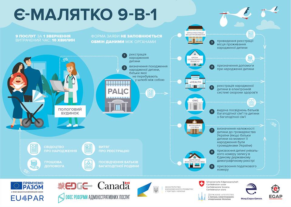 Проект має на меті об'єднати дев’ять публічних послуг, пов'язаних із народженням дитини, а також надасть змогу батькам онлайн або одразу в пологовому будинку отримати всі послуги за однією заявою (серед них, реєстрація народження та місця проживання, допомога при народженні, призначення ІНН тощо).
