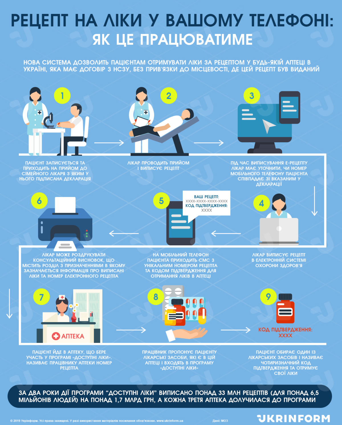 Крок 5. На мобільний телефон пацієнта приходить смс з унікальним номером рецепта та кодом підтвердження для отримання ліків в аптеці. Зміст СМС: «Ваш рецепт : ХХХХ-ХХХХ-ХХХХ-ХХХХ. Код підтвердження: ХХХХ».