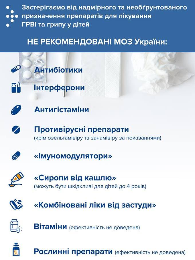Щоби допомогти нам розібратися, Центр громадського здоров'я МОЗ України склав перелік ліків, які ми НЕ рекомендуємо вживати у випадку грипу чи ГРВІ у дітей.