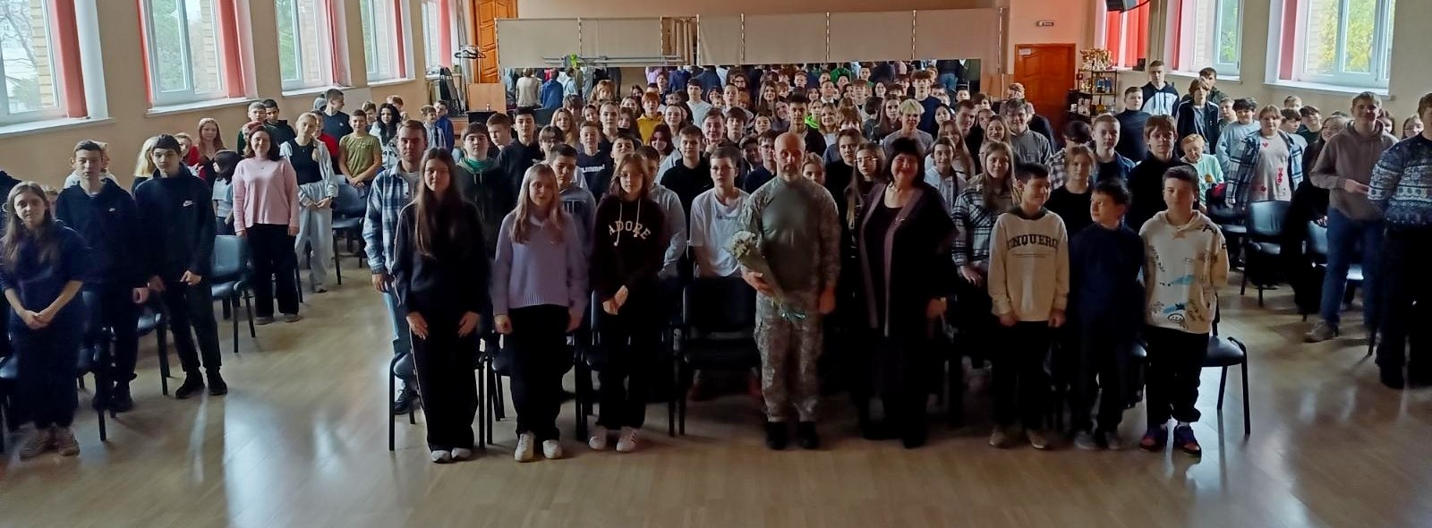 У Гімназії №201 відбулася зустріч з почесним гостем — Євгеном Соловйовим, військовим льотчиком 1-го класу Армійської авіації, миротворцем, учасником російсько-української війни, Героєм України, кавалером Ордену Богдана Хмельницького II та III ступенів.