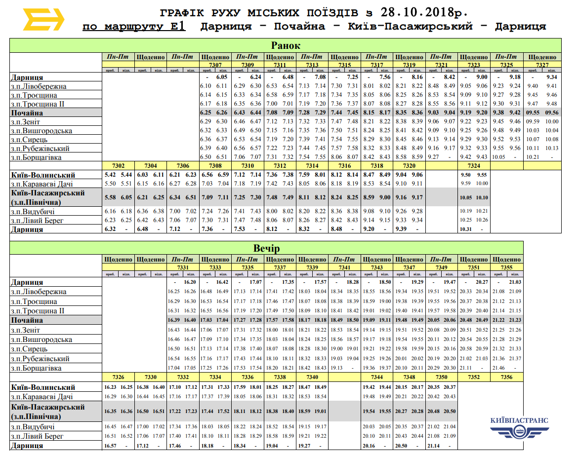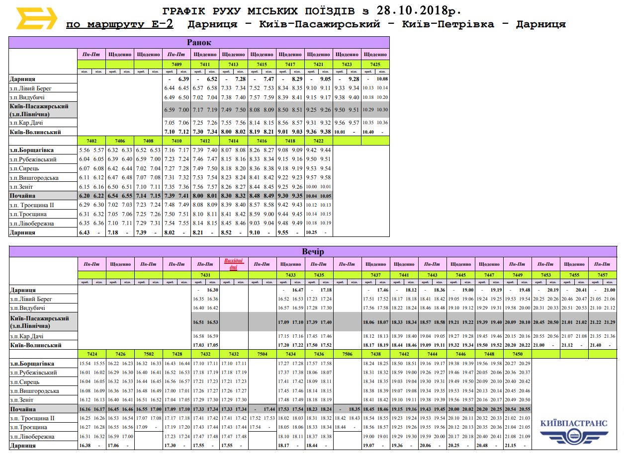 Із 28 жовтня 2018 року змінюється розклад електропоїздів «Міська електричка». Про це повідомили у КП «Київпастранс».