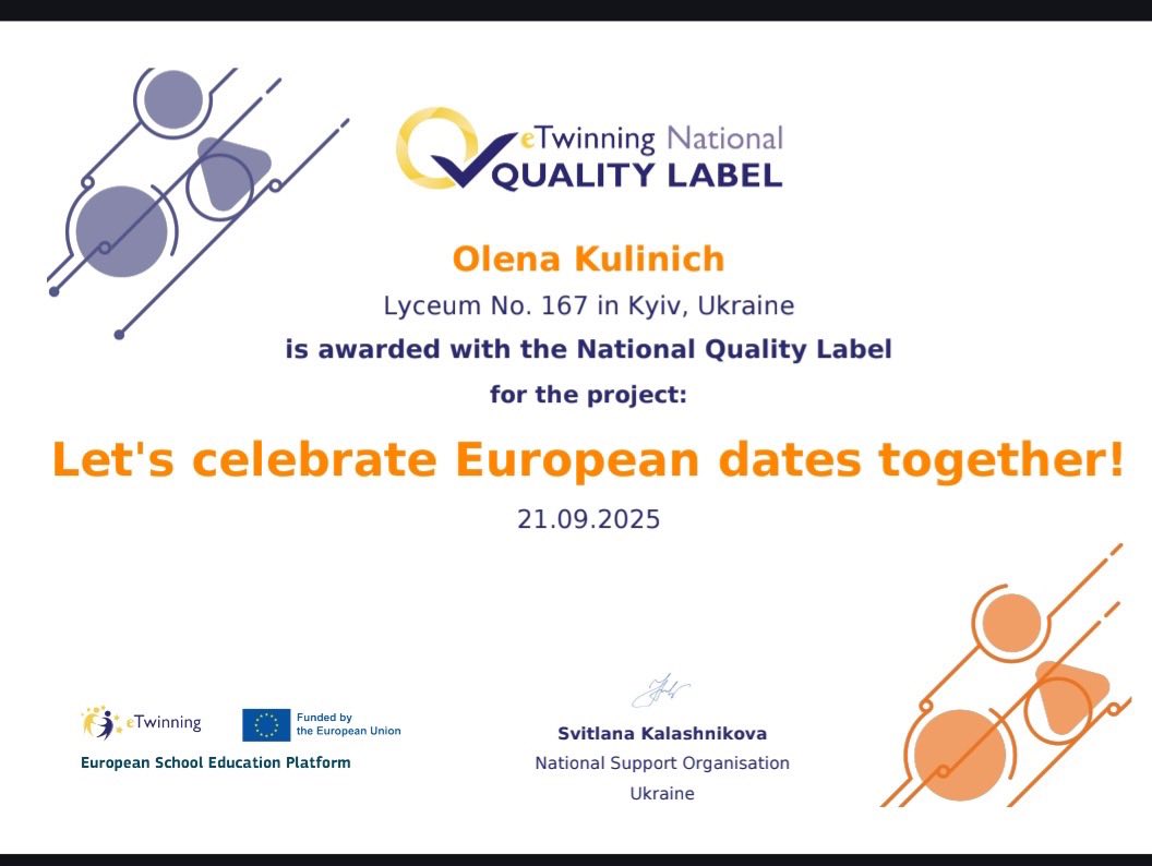 За результатами участі у проєкті команда Ліцею №167 отримала Національний знак якості eTwinning (eTwinning National Quality Label) — відзнаку за високий рівень роботи, творчість та активну взаємодію у міжнародному освітньому середовищі.