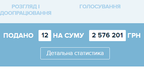 Зазначимо, що в п'ятницю подали 9 проектів на суму близько 1,6 млн грн. Наразі вартість 12-ти проектів складає 2,5 млн. Тобто за вихідні сума збільшилася майже на 1 млн грн.