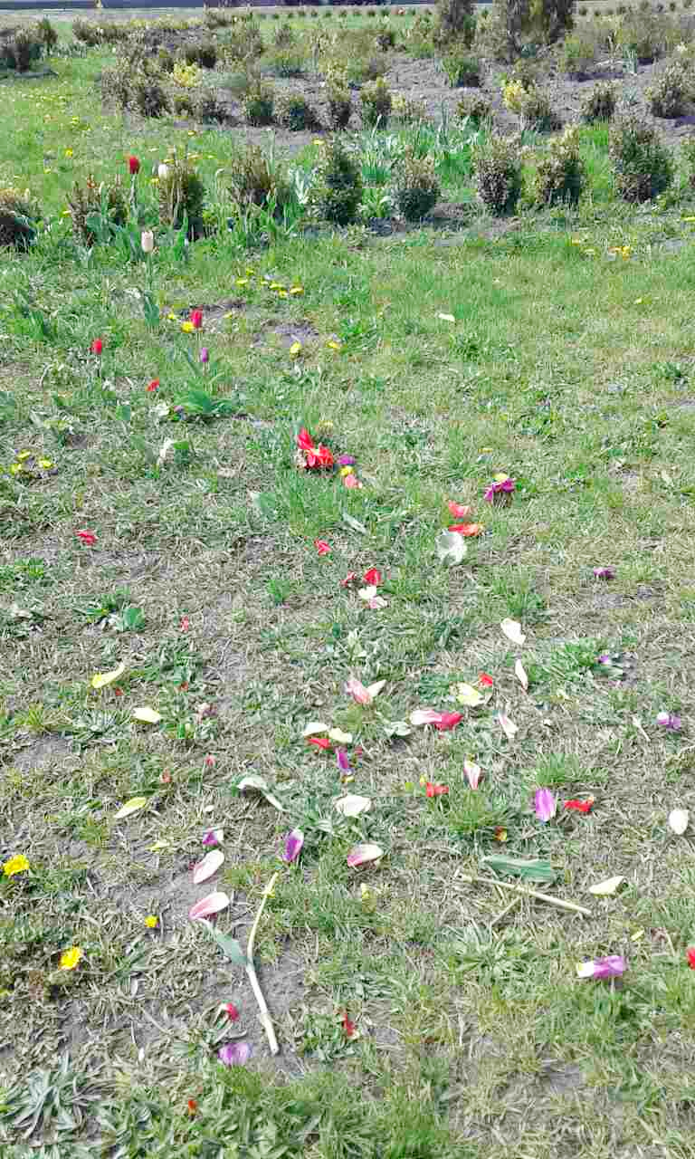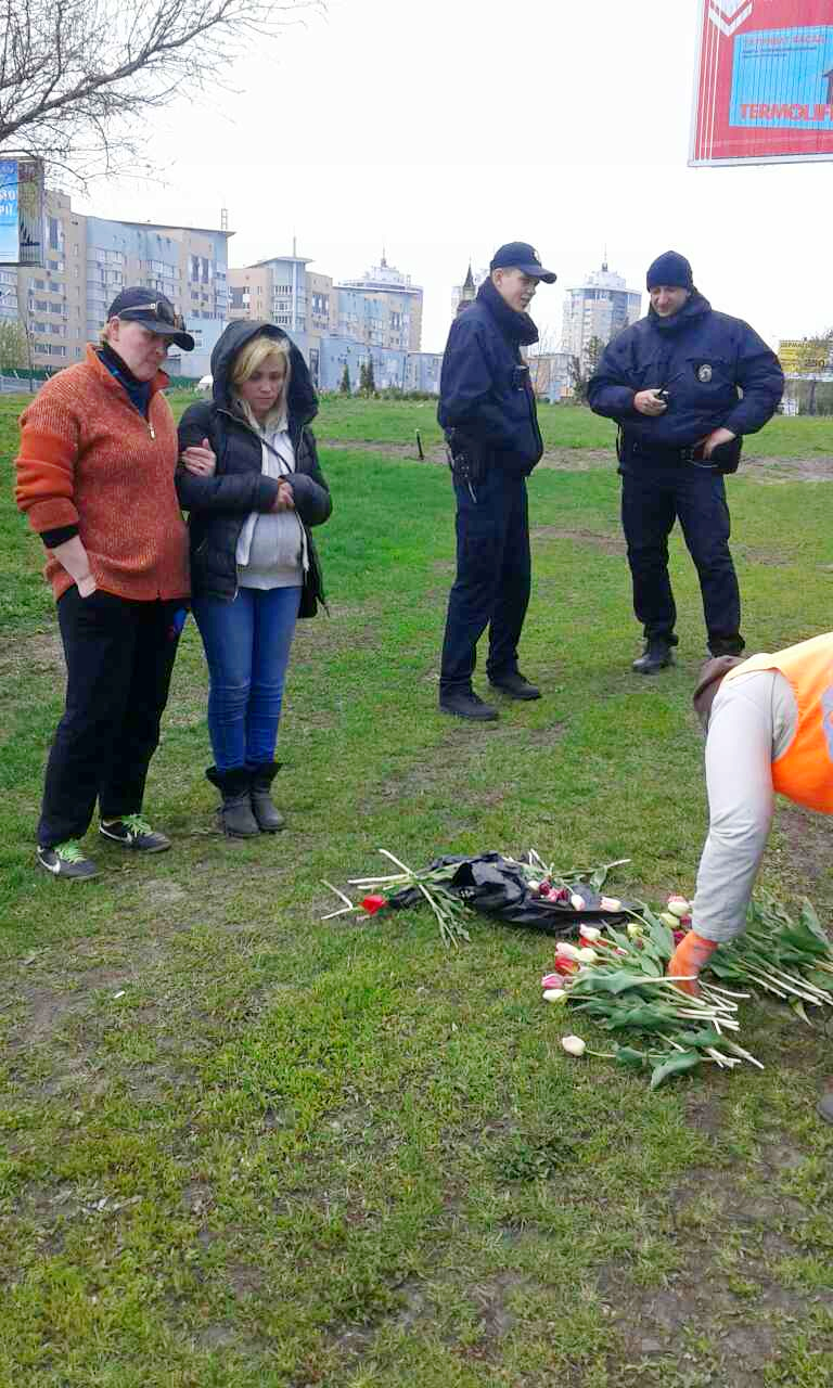 Сьогодні, серед білого дня, дві жінки вирізали тюльпани на транспортній розв'язці біля станції метро Лівобережна. Близько 60 кв. м квітника було понівечено. Особи, які вчинили даний злочин, затримані представниками Нацполіції та понесуть відповідальність згідно чинного законодавства України.