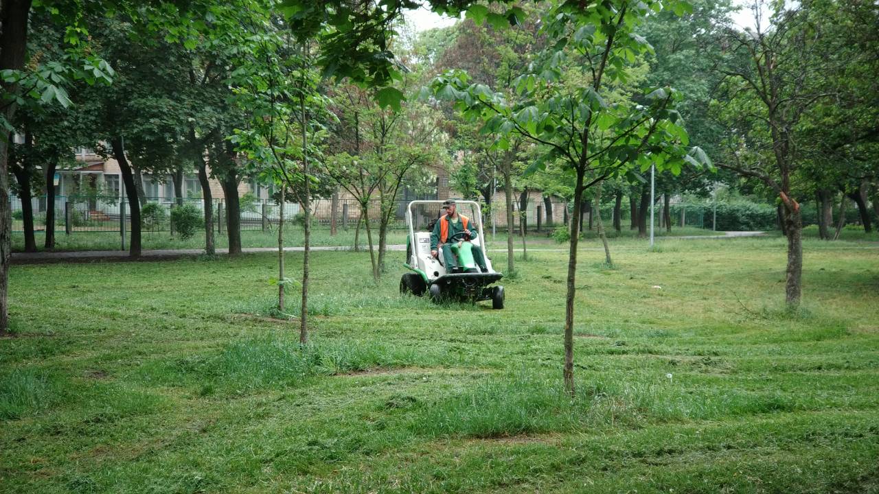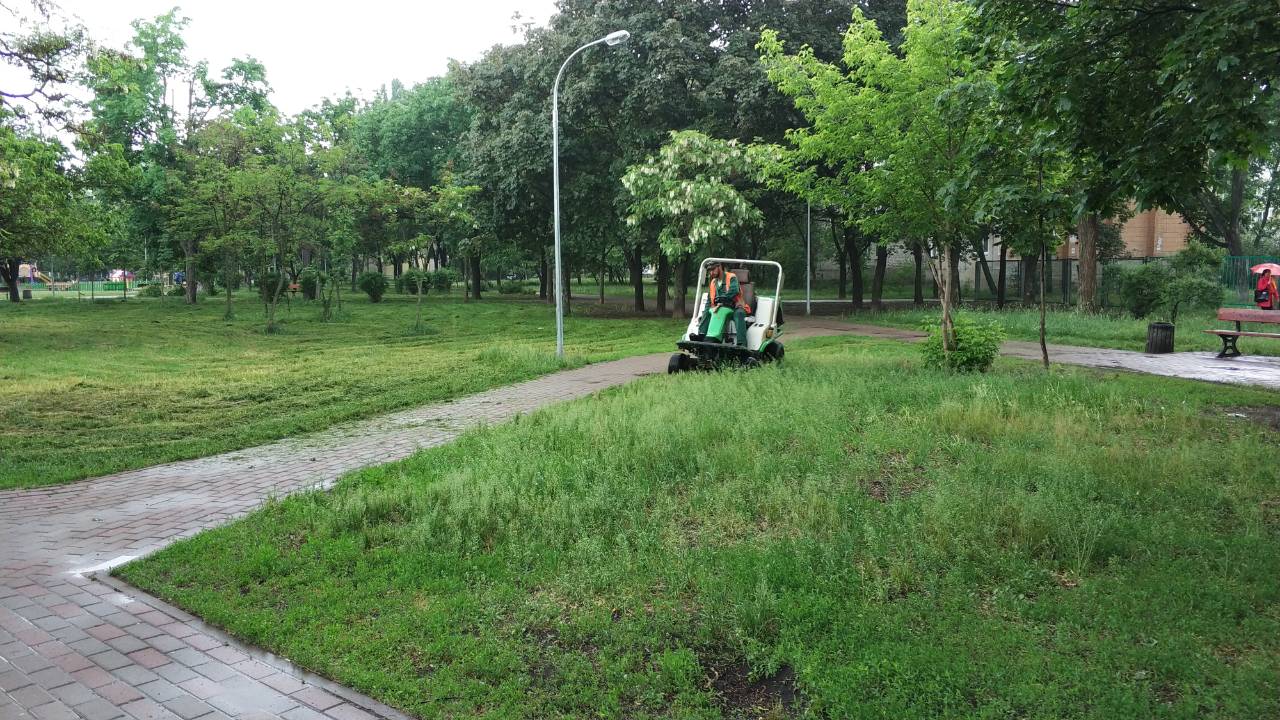 Крім того, продовжуються роботи з покосу трави газонів та прибирання випадкового, дрібного сміття, підмітання доріжок та біля лав, очищення урн від сміття.