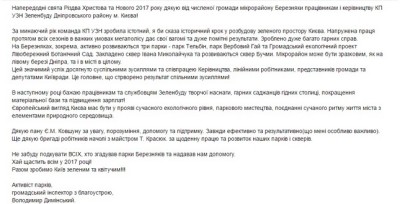 Коли працюєш з людьми та для людей, важливо мати зворотній зв’язок, бачити реакцію на свої дії, отримувати відгуки про свою роботу. А коли ці відгуки – позитивні, особливо приємно! Таку подяку від громади мікрорайону Березняки напередодні новорічно-різдвяних свят отримали працівники районного Комунального підприємства по утриманню зелених насаджень. Численна громада мікрорайону відзначила їхню щоденну кропітку працю, істотний внесок у розбудову зеленого простору столиці, а саме - активний розвиток трьох парків – парк Тельбін, парк Вербовий Гай та Громадський екологічний проект Лівобережний Ботанічний Сад. Також, мешканці висловили подяку за те, що закладено сквер імені Івана Миколайчука, розвивається сквер Бучми.