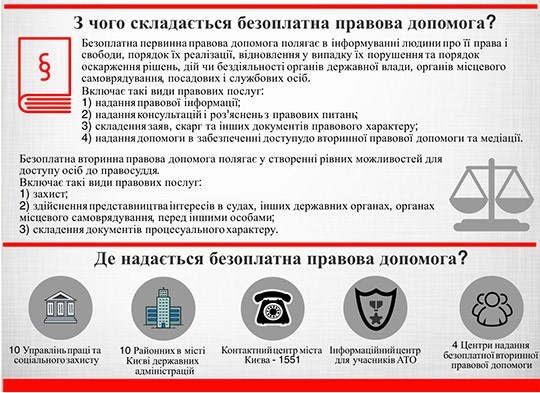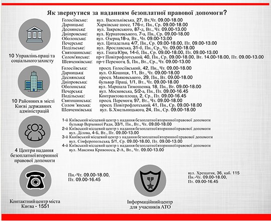 До «Центру правової допомоги киянам, які опинилися у складних життєвих обставинах», що функціонує при Київській міській державній адміністрації, у 2016 році звернулося понад 25 тисяч киян. Про це повідомив керівник апарату КМДА Володимир Бондаренко. «Упродовж 2016 року юрисконсультами Центру надано первинну безоплатну правову допомогу 25 568 особам, які опинились у складних життєвих обставинах. Окрім цього, за визначений період провідними юрисконсультами Центру було надано вторинну безкоштовну правову допомогу з представництвом інтересів у судах різних інстанцій 177 киянам», – розповів Володимир Бондаренко.