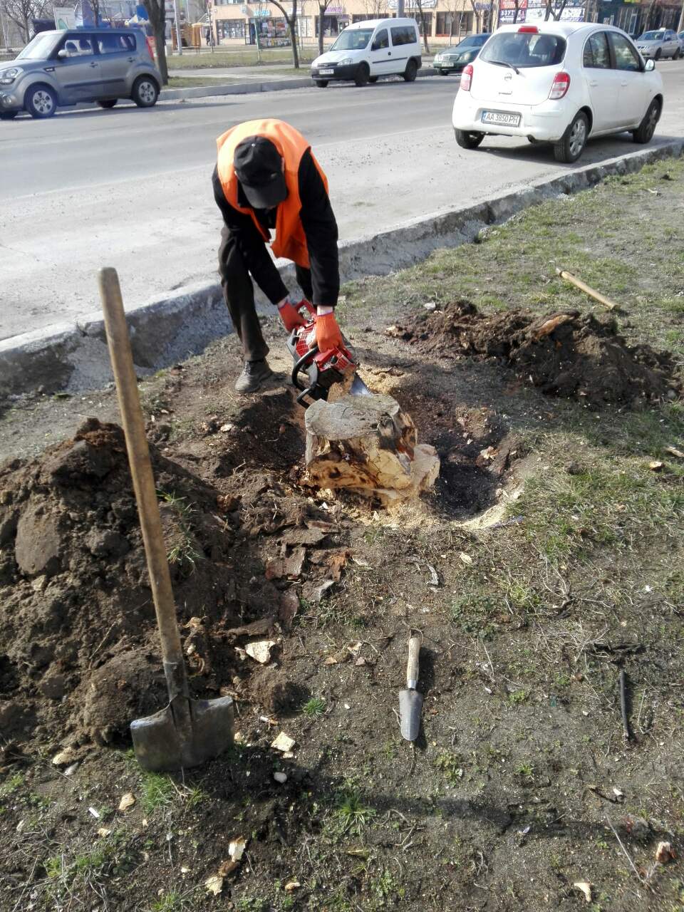 Співробітниками Комунального підприємства по утриманню зелених насаджень Дніпровського району продовжуються роботи з корчування пнів вздовж проспекту П. Тичини.