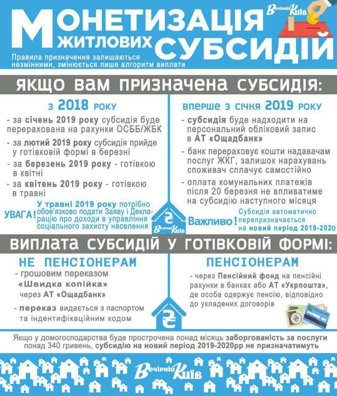 - другий етап з 01.05.2019: монетизація субсидій розповсюджується на усіх громадян України, які в минулі роки отримували субсидію (пільги) на опалення, тверде паливо, електроенергію, газ і воду.