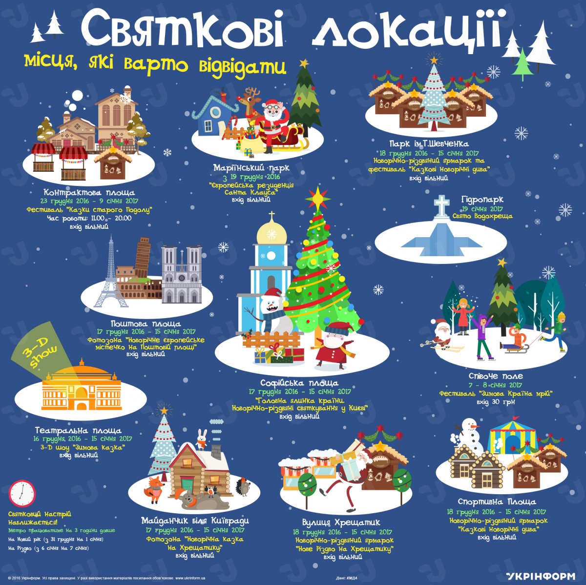 Новорічно-різдвяні свята у 2017 році дарують українцям 6 святкових вихідних. Нудьгувати на свята киянам та гостям столиці точно не доведеться, адже, новорічні та різдвяні події відзначатимуть по всій столиці. Відтак Укрінформ підготував інфографіку про те, куди можна піти в Києві на Новий рік та Різдво.