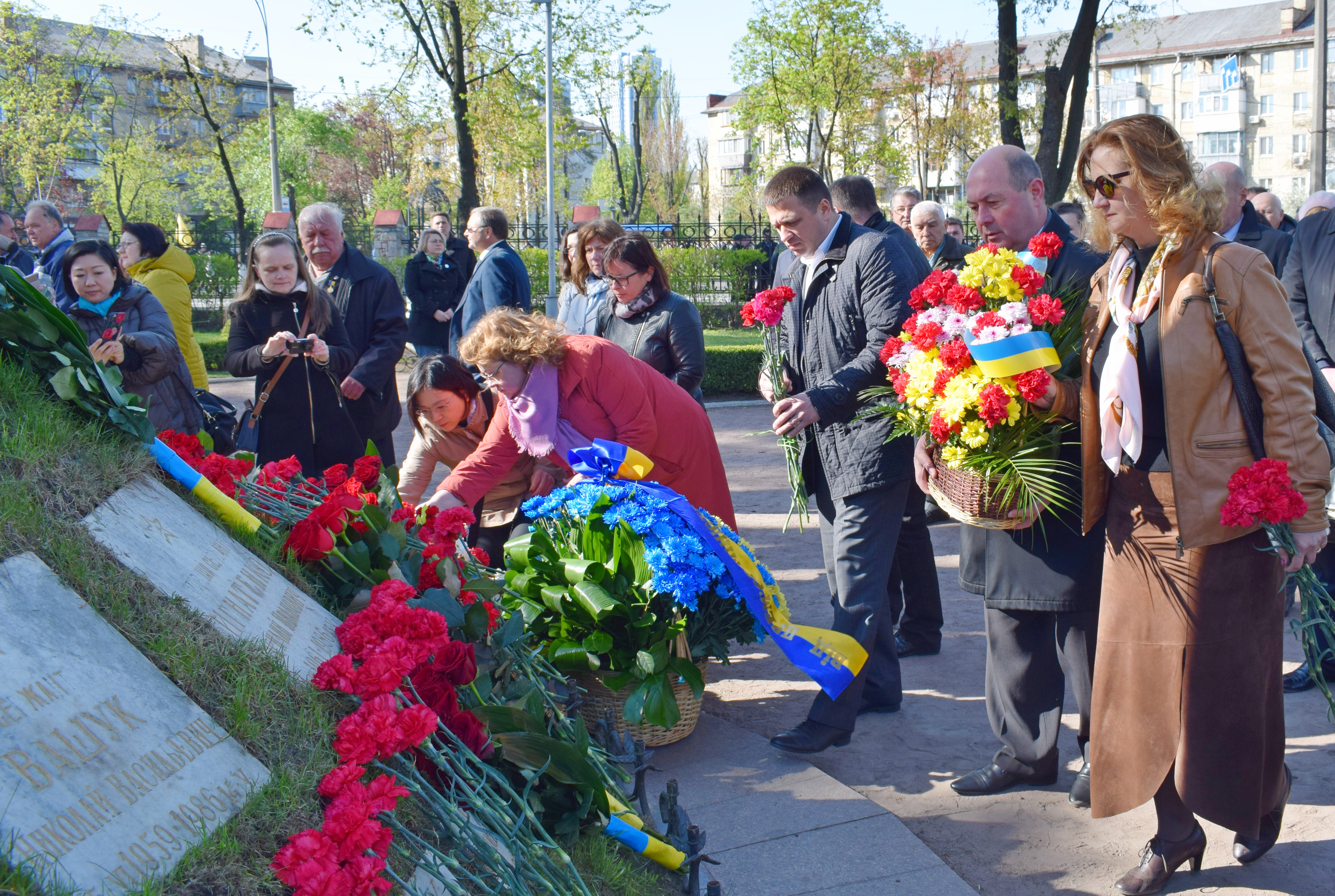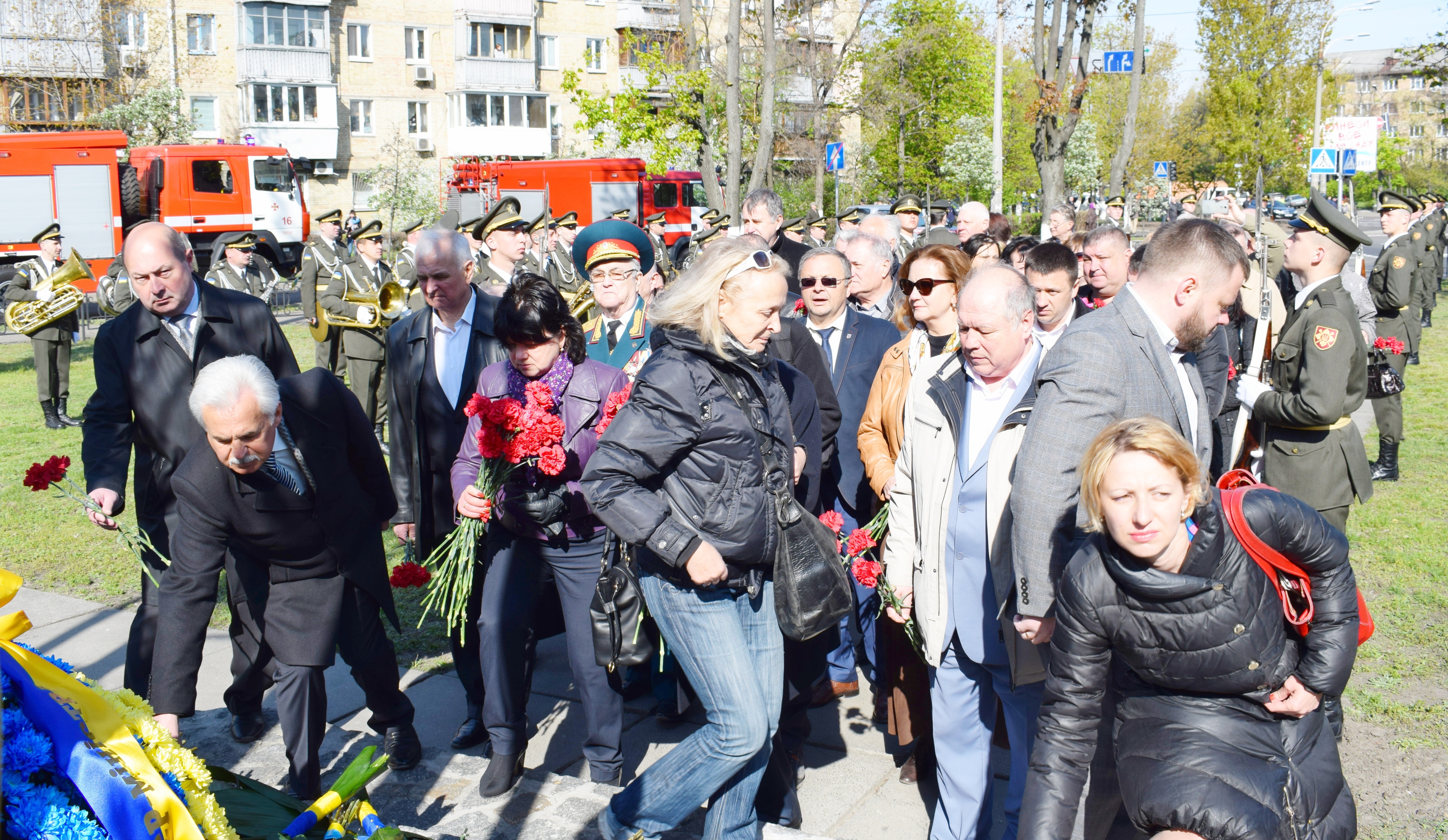 О 9.30 год відбулась церемонія покладання квітів до Меморіального Кургану «Героям Чорнобиля» на території церкви Св. Архангела Михаїла УПЦ та пам’ятного знаку «Воїнам Чорнобиля» на території Меморіального комплексу жертвам Чорнобильської катастрофи. У церемонії покладання квітів взяв участь Прем'єр-міністр України Володимир Гройсман та члени Уряду, перший заступник голови Київської міської державної адміністрації Геннадій Пліс та керівники структурних підрозділів Київської міської держадміністрації, голова Дніпровської районної в місті Києві державної адміністрації Петро Онофрійчук та його заступник Алла Загородня, ліквідатори аварії на ЧАЕС, родичі загиблих героїв Чорнобиля, представники духовенства та громадськості. Хвилиною мовчання учасники заходу вшанували пам’ять загиблих учасників ліквідації наслідків аварії.