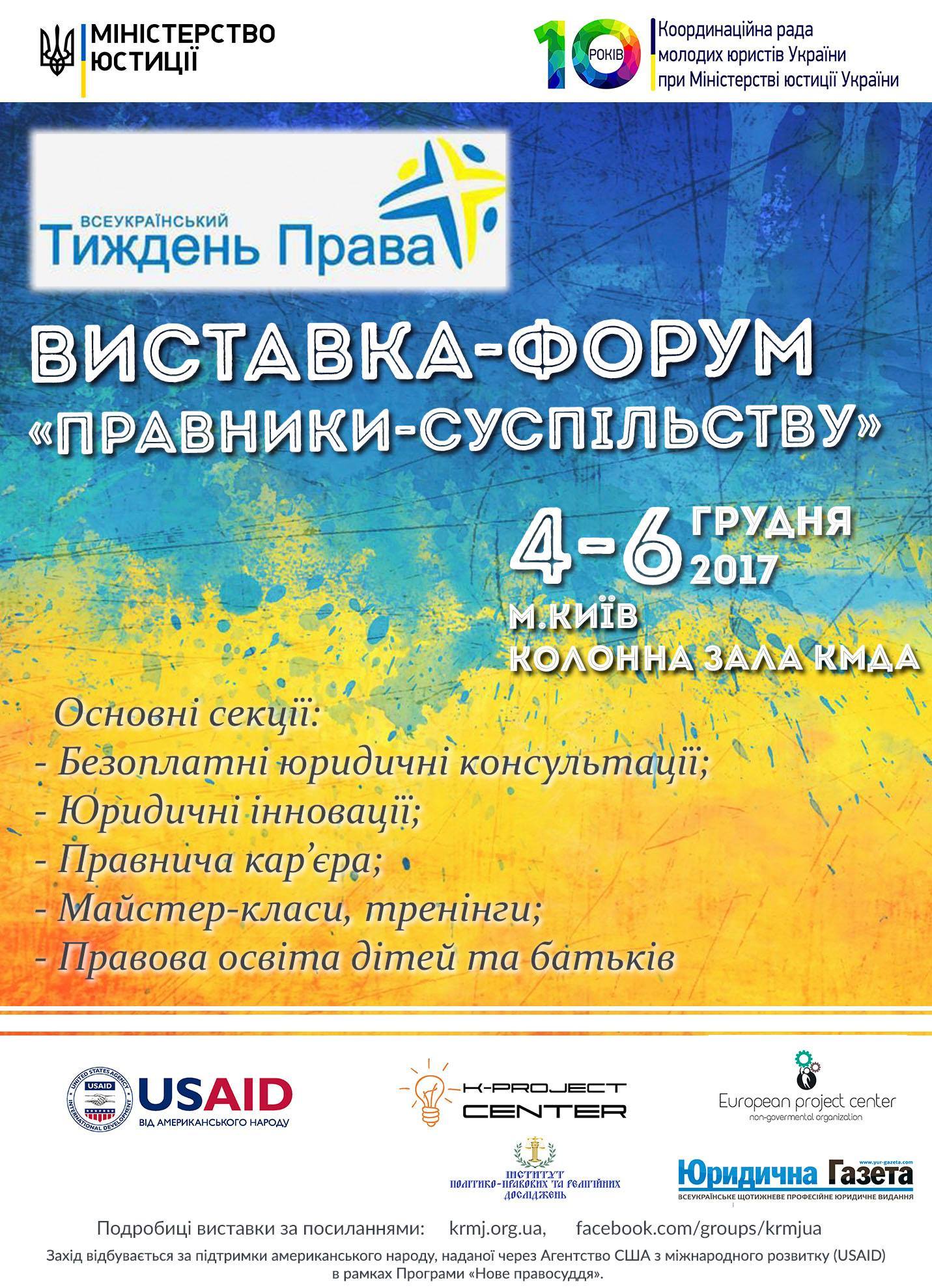 4-6 грудня у Києві в рамках Всеукраїнського тижня права 2017 року відбудеться виставка-форум «Правники-суспільству». Захід відбудеться у колонній залі Київської міської державної адміністрації (вул. Хрещатик, 36).