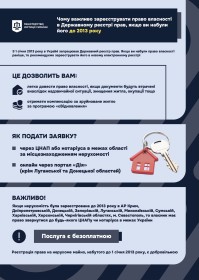 Із 1 січня 2013 року в Україні запрацював Державний реєстр речових прав на нерухоме майно. Про це нагадують у Міністерстві юстиції України та рекомендують громадянам внести до цього реєстру права власності, набуті до 1 січня 2013 року.