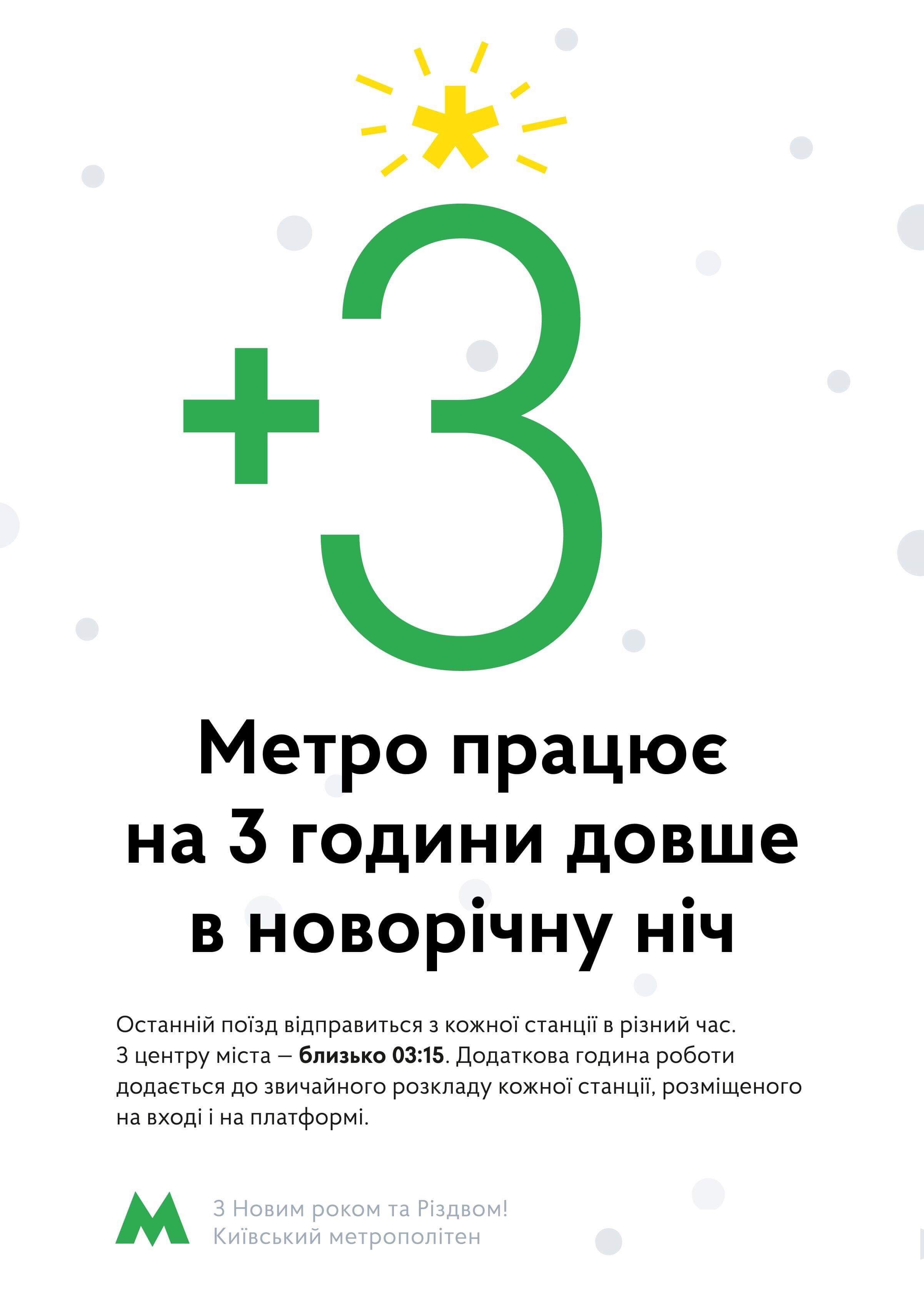 "Останній поїзд із кожної станції відправиться у різний час. З центру міста – близько 3.15 год. Додаткова година роботи додається до звичайного розкладу кожної станції, розміщеної на вході і на платформі", - йдеться у дописі.