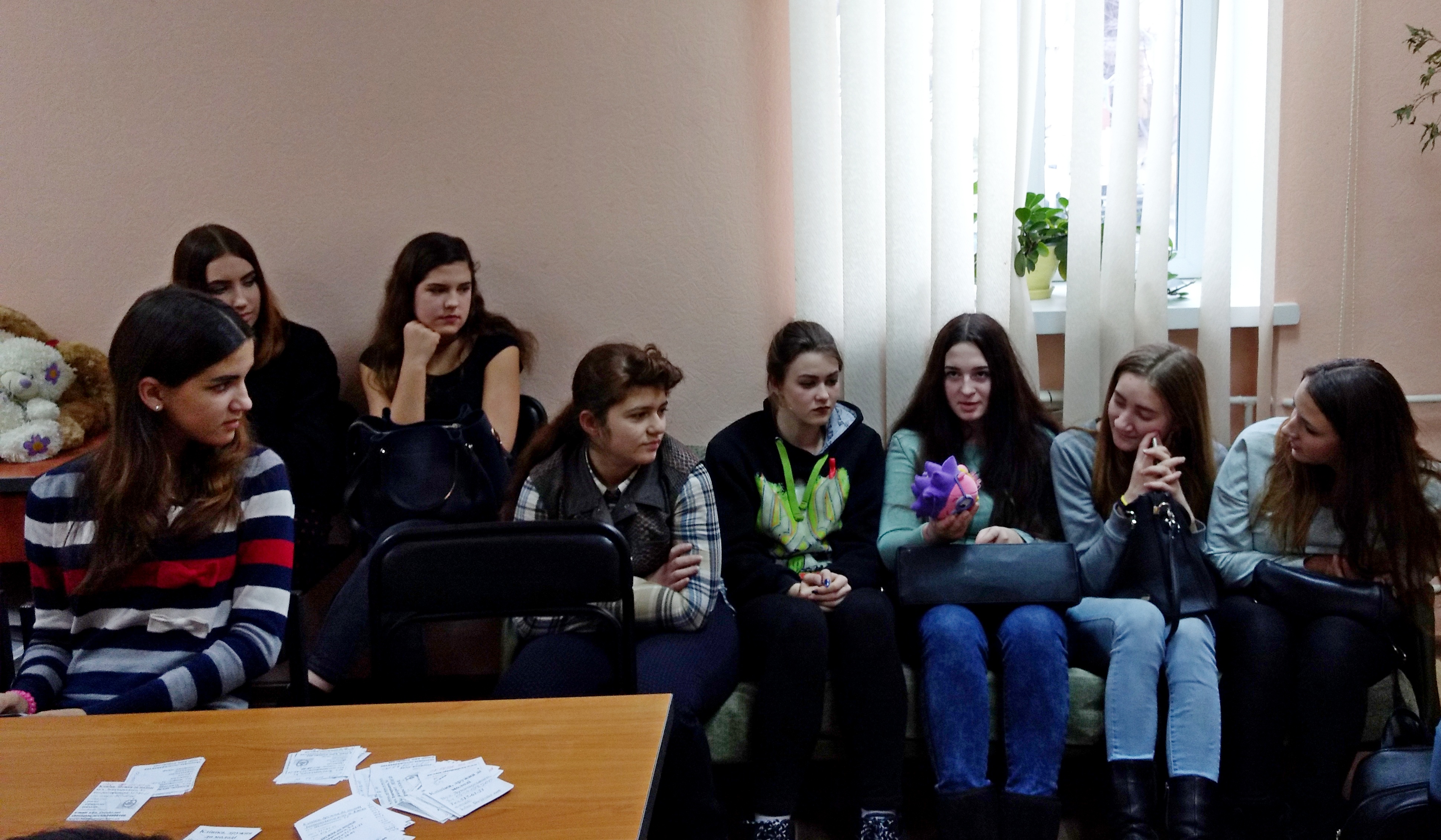 1 грудня - Всесвітній день боротьби з ВІЛ-інфекцією. В Клініці, дружній до молоді Дніпровського району м. Києва (вул. Митрополита Андрея Шептицького, 3Г) сьогодні відбулась зустріч психологів та акушера-гінеколога з ученицями 1-го курсу Київського вищого професійного училища технологій та дизайну одягу (просп. Юрія Гагаріна, 22). Розмова йшла про епідемію ВІЛ. Дівчата перший раз потрапили до Клініки. Вони були вражені можливостями для молодих людей, а також отримали цікаву та корисну інформацію.