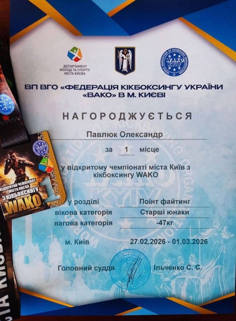 Учень 9 класу Ліцею №136 Олександр Павлюк здобув почесне І місце у відкритому чемпіонаті з кікбоксингу WAKO, що відбувся у столиці!