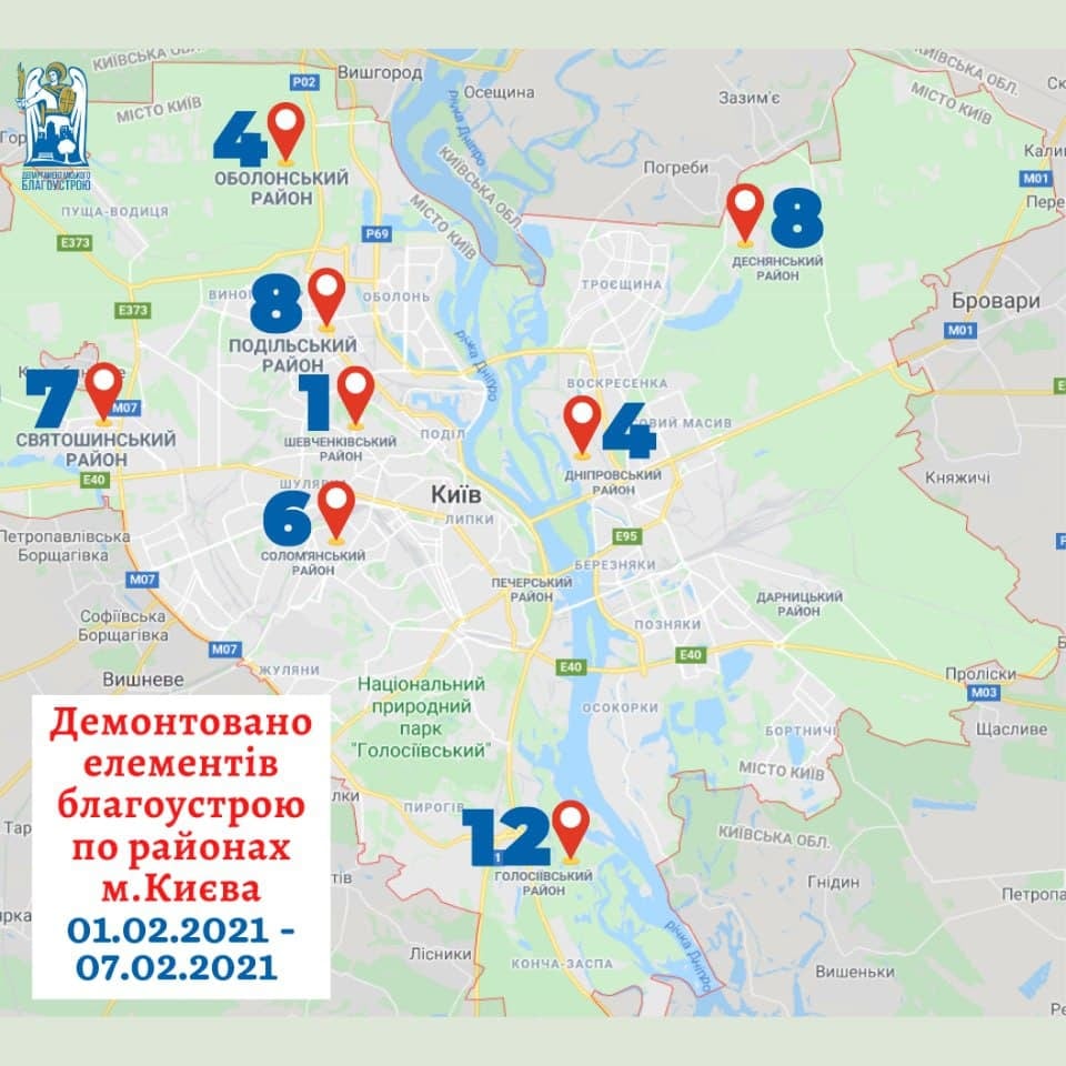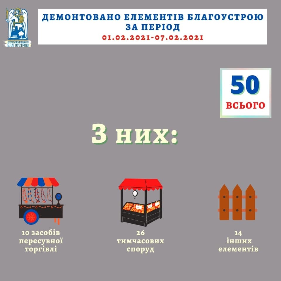Комунальним підприємством «Київблагоустрій» та деякими власниками тимчасових споруд (ТС), які на вимогу вищевказаного комунального підприємства самостійно демонтували свої об’єкти. Впродовж минулого тижня в місті Києві прибрано 50 незаконних елементів благоустрою. Серед них 4 об'єкти в Дніпровському районі за адресами: