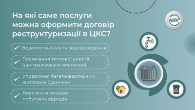Комунальний концерн «Центр комунального сервісу» (ЦКС) інформує: в разі виникнення заборгованості за житлово-комунальні послуги споживачам варто оформити договір реструктуризації заборгованості. Він дає можливість погашати накопичений борг частинами. Умови реструктуризації враховують у кожному окремому випадку фінансову спроможність боржника, тому ефективність цього механізму доведена на практиці.