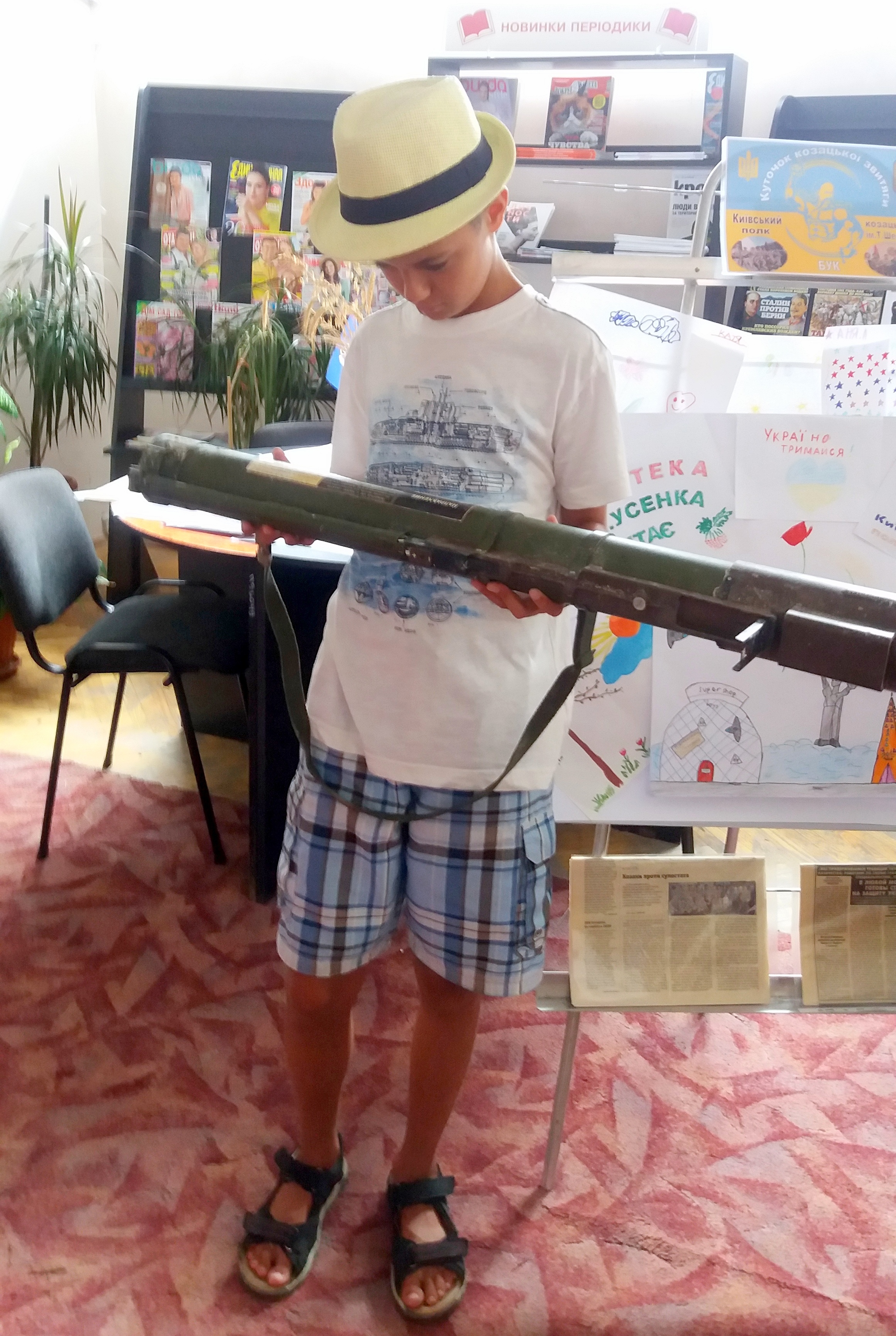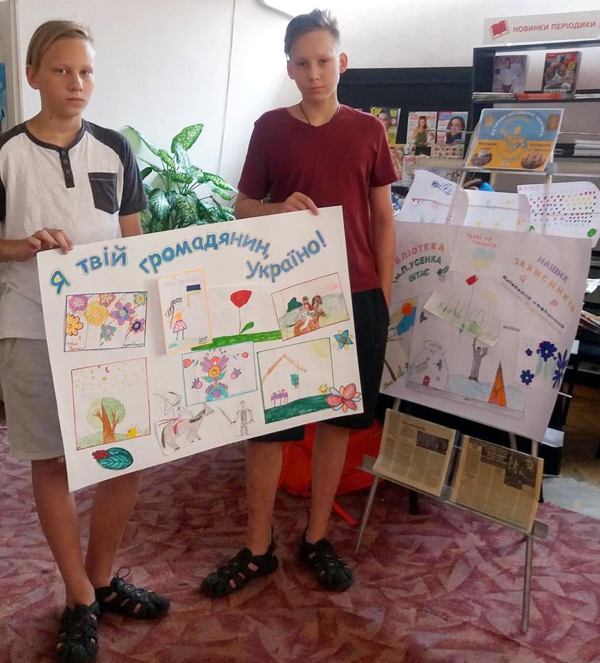 Щоб підтримати бійців співробітники та відвідувачі бібліотеки передали пану Володимиру для відправлення в зону АТО плакат-підтримку, малюнки, обереги, які напередодні були створенні маленькими читачами, а також солодкі смаколики до чаю. Кожна творча, виконана з душею, робота несе воїнам щиру подяку за їхню службу, найтепліші побажання всіляких благ та настанову повертатись живими! А наші друзі-козаки, навзаєм, передали до Куточка козацької звитяги нові експонати: справжнє бойове спорядження та друковані матеріали.