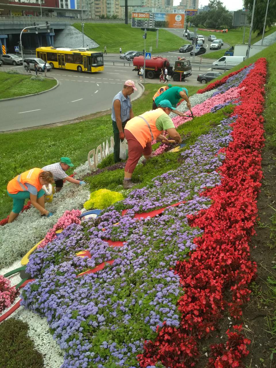 Зеленбудівці пропололи квітники та видалили оцвітину на бульв. Праці та на транспортній розв’язці біля метро Лівобережна
